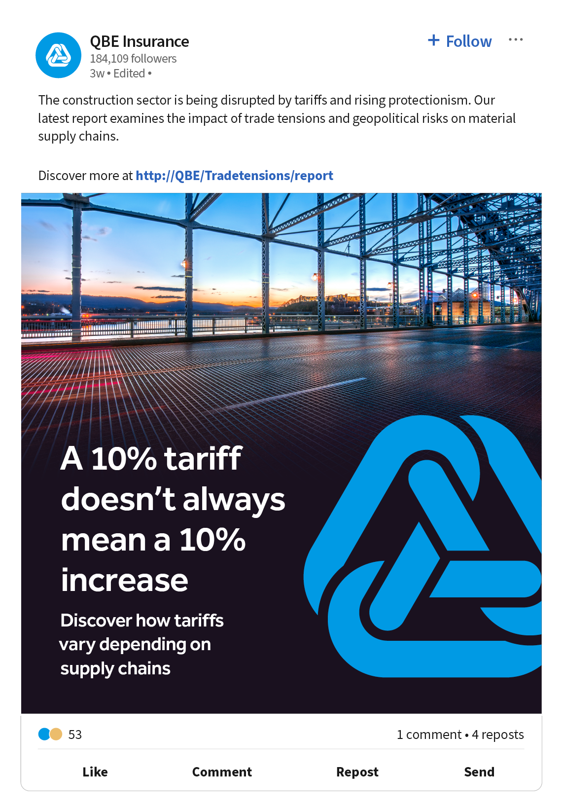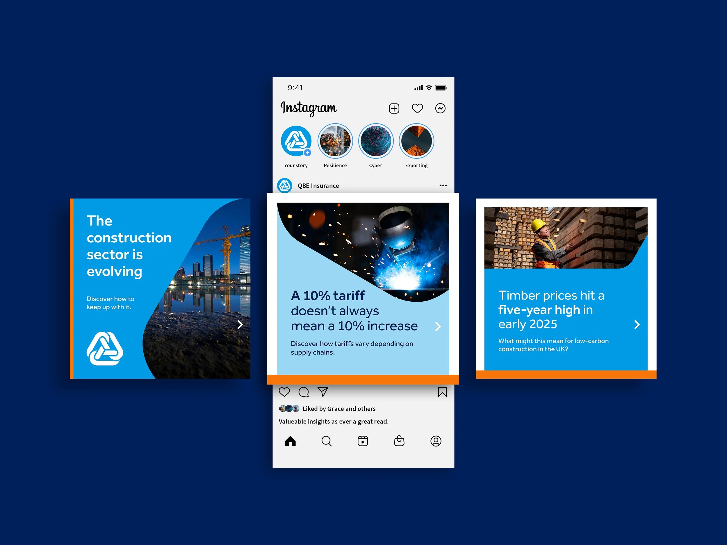 To support the monthly launch of the Sector Resilience Reports, I developed a series of social media templates designed to capture attention and strengthen brand recognition. By utilising the QBE links symbol through striking, unconventional crops, as a framing device to house campaign copy and photography— to creatine a cohesive, visually compelling system across all launch communications.